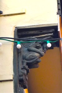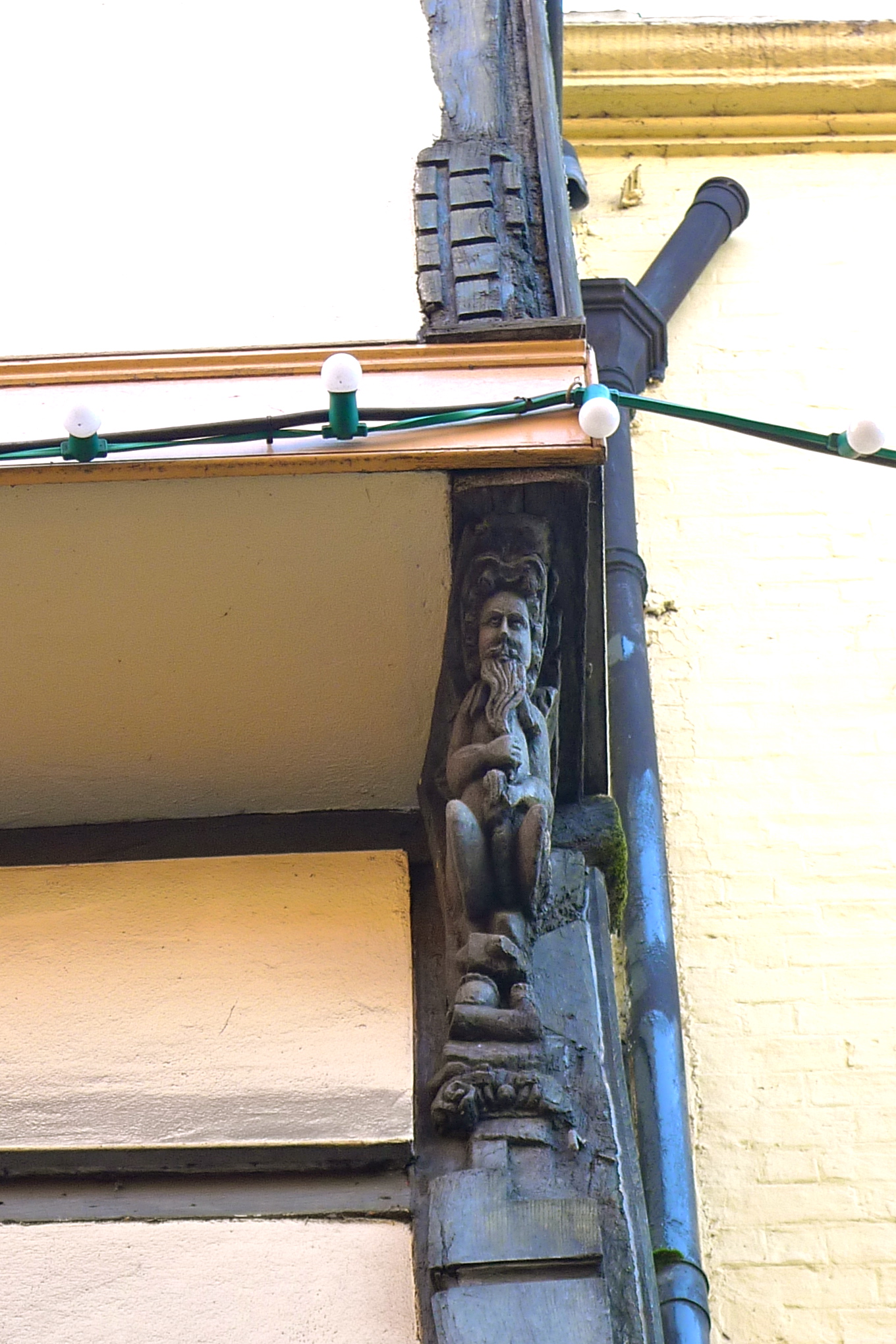 Carved ‘grotesques’ or brackets support each of the overhanging floors. These carvings leave little to the imagination.  Local lore will tell you it was a brothel and was used by Samuel Pepys – a student from across the road.  Students and ladies of the night seemed to go hand in hand at one time in Cambridge.